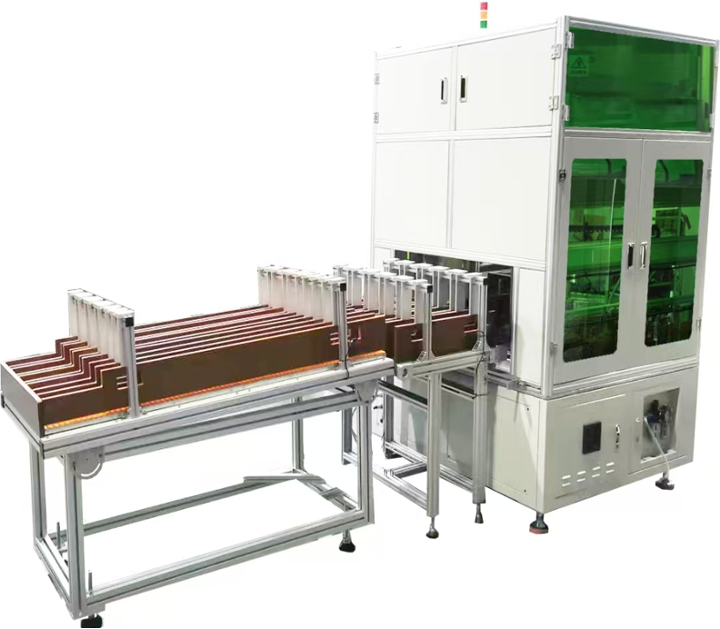 OCV automatic sorting equipment for square shell battery cells,used for testing and sorting parameters such as internal resistance and voltage of square shell battery cells.The equipment can accurately sort the battery cells into the corresponding gear output slots according to the set internal resistance and voltage values,achieving battery cell sorting in different level.