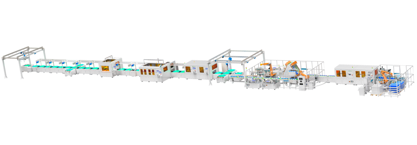The power/energy storage square shell battery module PACK automatic production line includes cell feeding,cell height measurement,ocv detection and sorting,automatic flipping and matching,adhesive bonding (compatible with automatic and manual adhesive bonding),automatic stacking and extrusion,polarity detection addressing,laser cleaning,aluminum row welding,electrical performance testing,PACK assembly and other automated production processes.