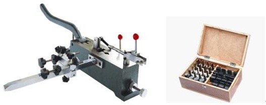 本机适用于加工 23.8mm 及以下的模切刀片,配备了 36 个阴阳模,能满足各种加工需求 Suitable for rule with 23.80mm heighness and below,equipped with 36PC male and female mould, can suitable for all the die for bending. |